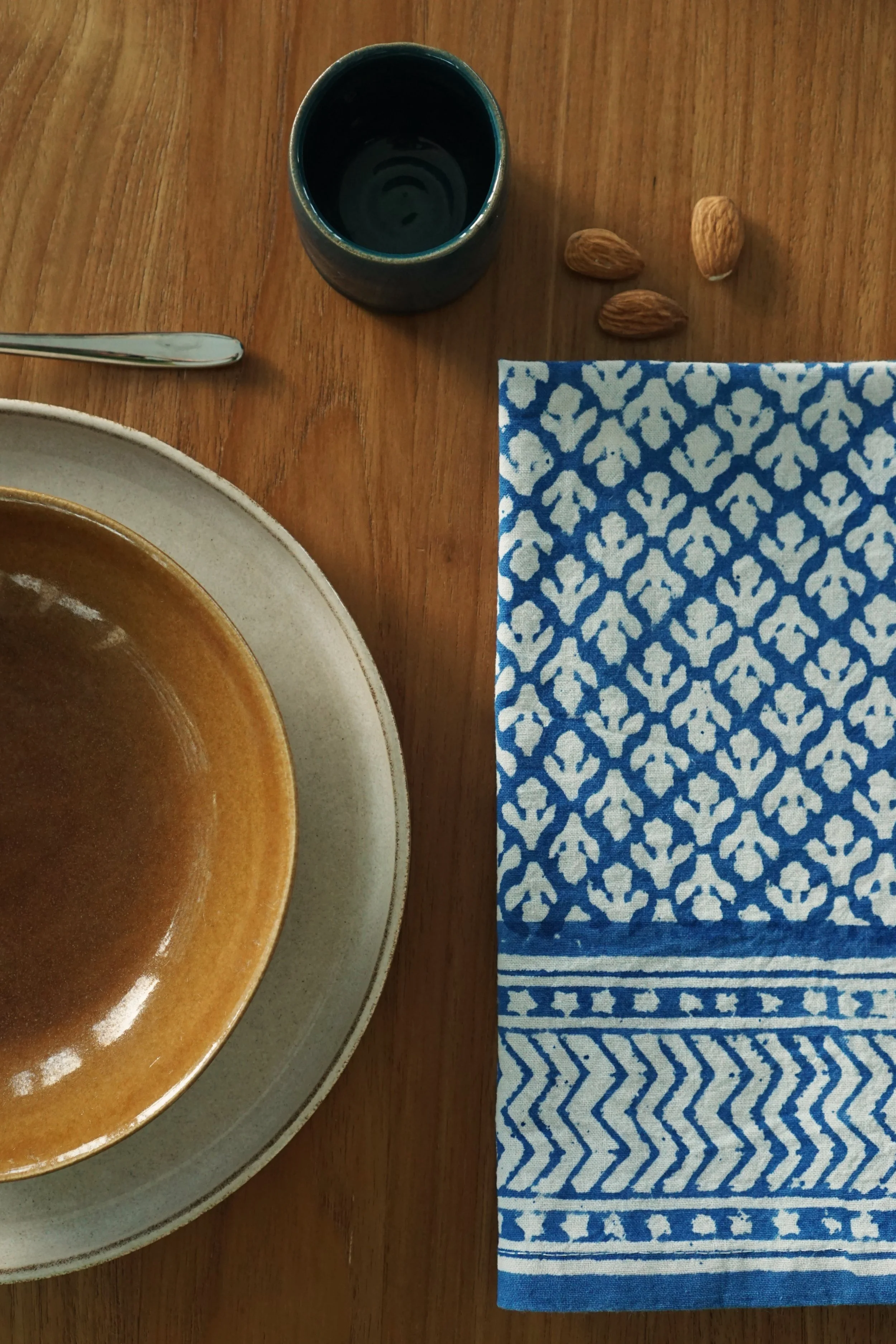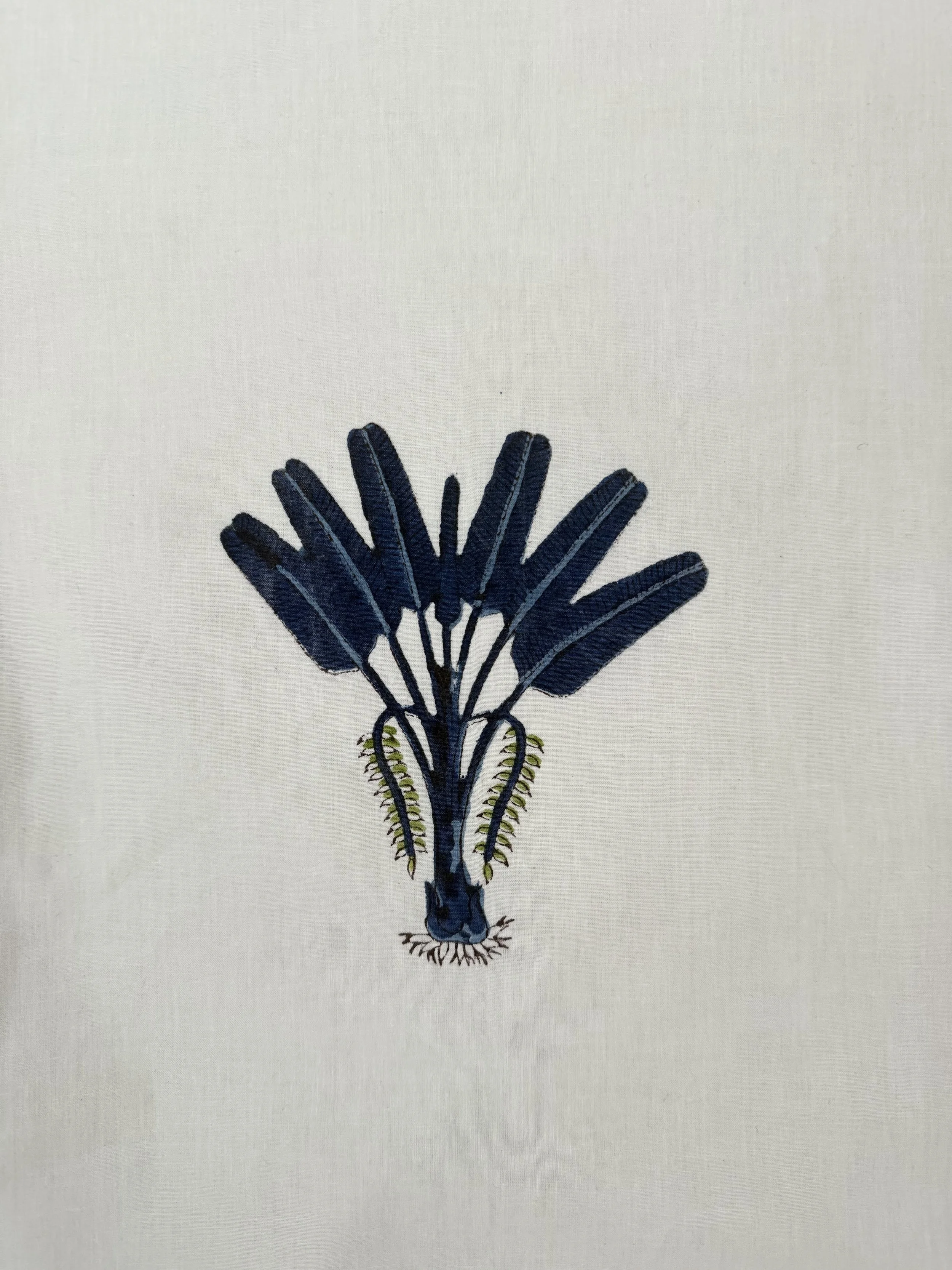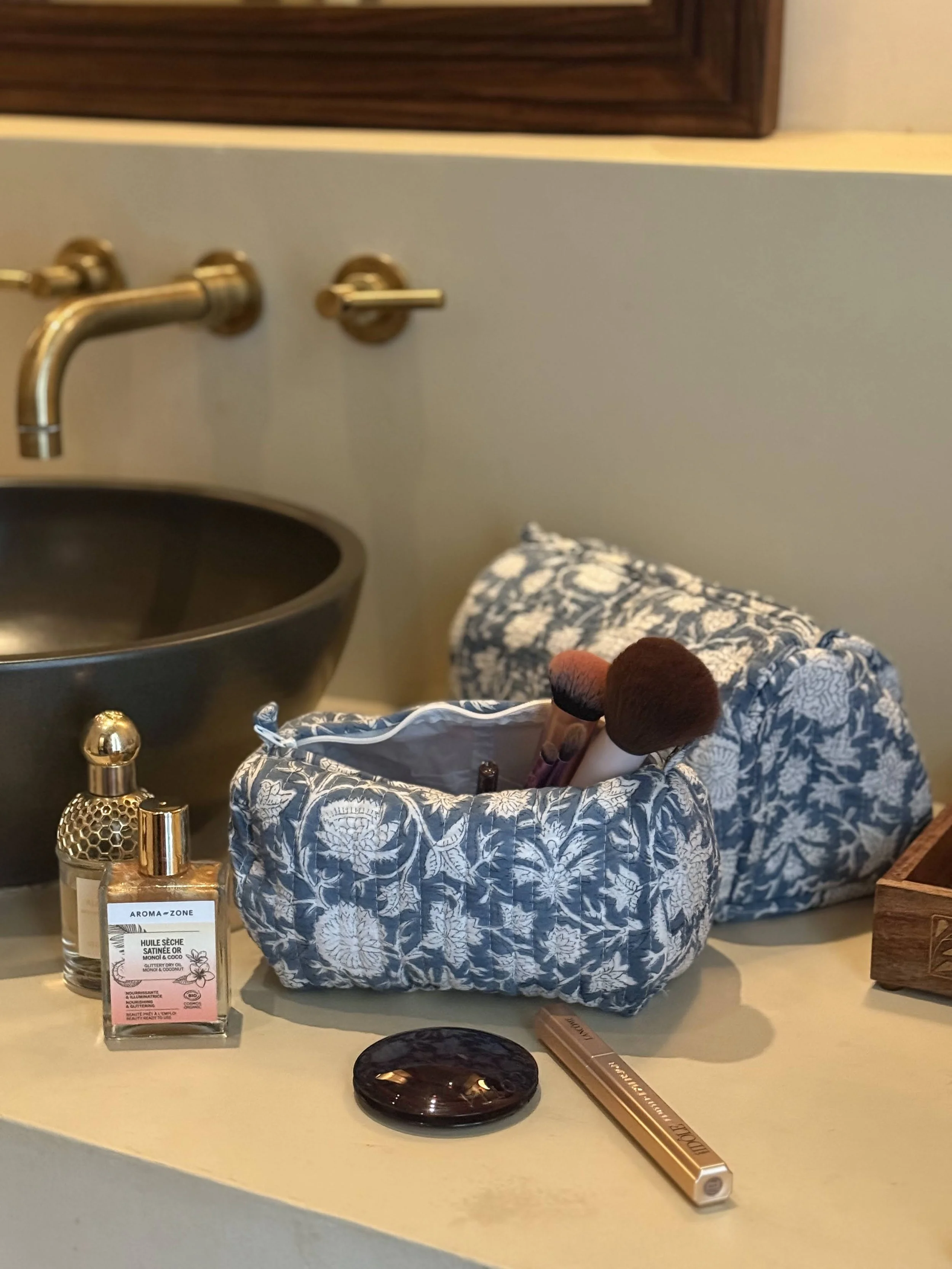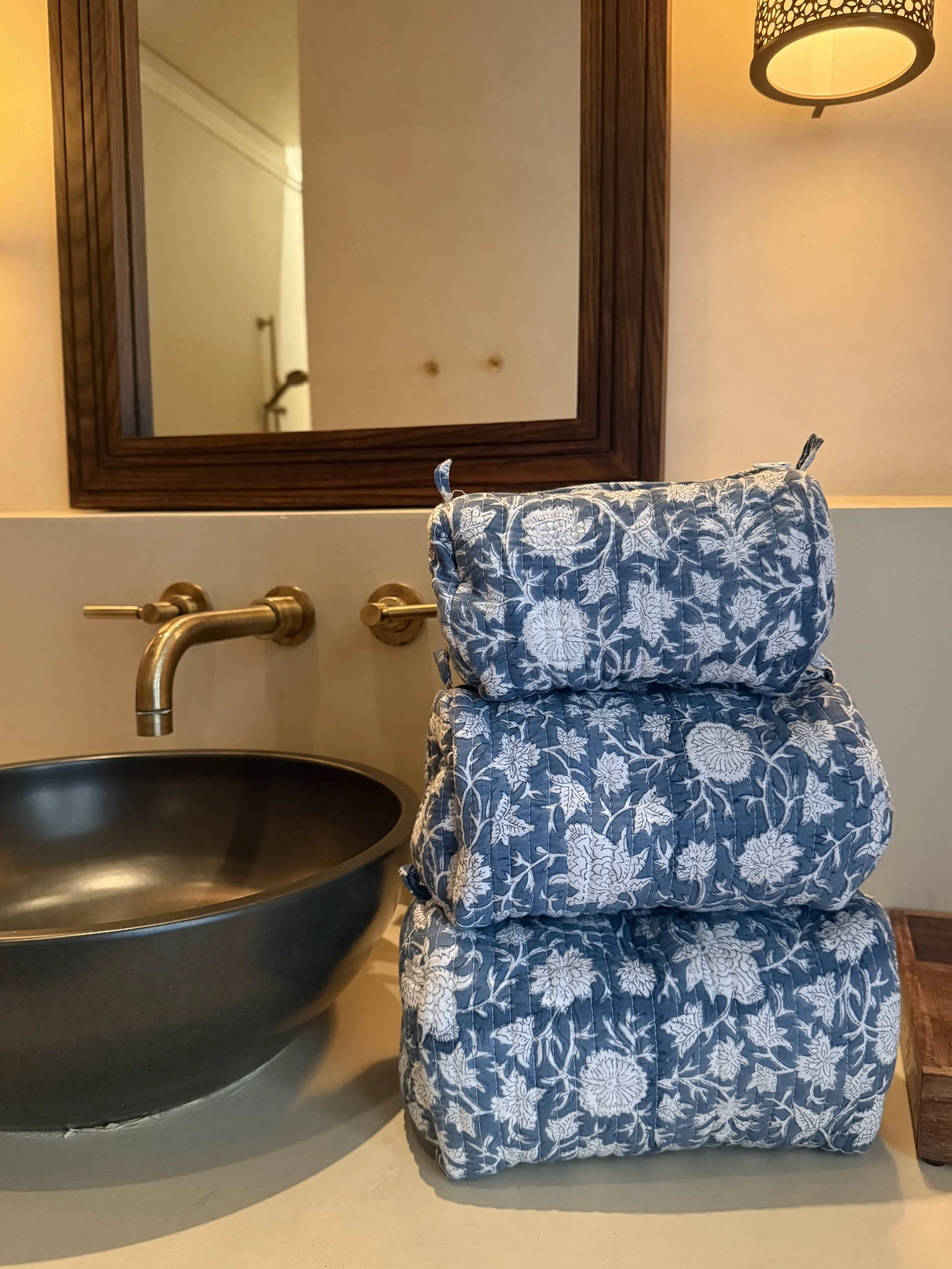 Each of our products is handmade in collaboration with a family-run factory that continues to preserve this ancestral know-how. Wooden blocks are carved by hand, then dipped into natural pigments and pressed onto soft cotton fabric, layer after layer. The slight irregularities in color and motif are not flaws, they are the signature of a truly handmade object.